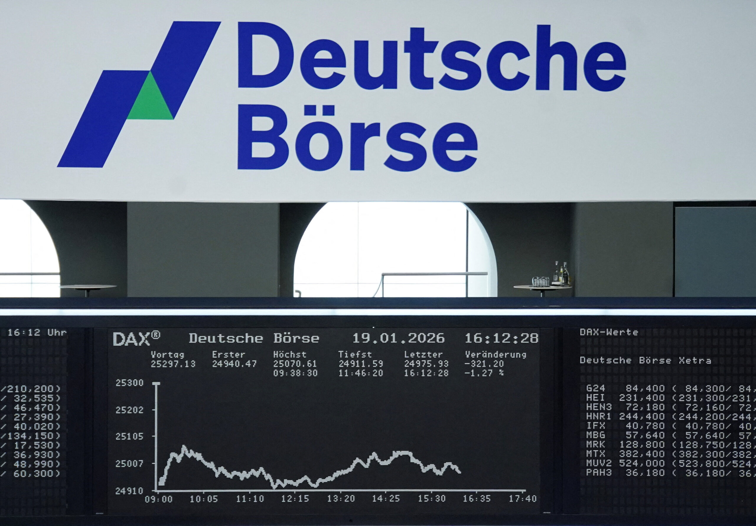 19 janvier (Reuters) – Les Bourses européennes ont terminé dans le rouge lundi, alors que Donald Trump menace d’imposer de nouveaux droits de douane en Europe sur fond de tensions autour du Groenland, ce qui fait grimper l’or et d’autres actifs refuge et pèse sur les marchés d’actions.