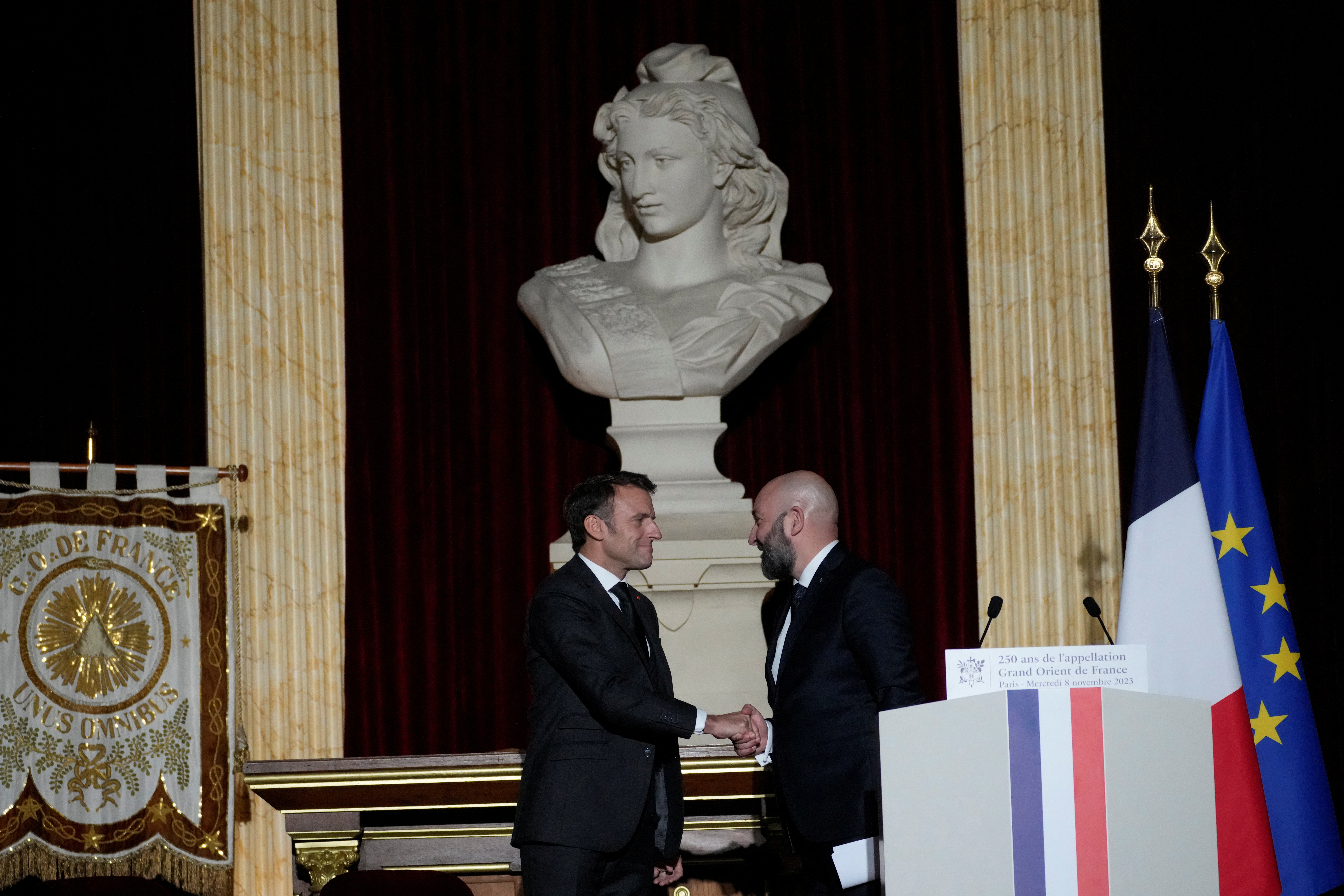 Devant le Grand Orient, Emmanuel Macron n’a pas indiqué s’il se rendrait à cette marche civique, à laquelle doit participer la Première ministre Elisabeth Borne, mais a renvoyé dos-à-dos – sans les nommer – l’extrême gauche et l’extrême droite sur leur position face au conflit au Proche-Orient et à l’antisémitisme.