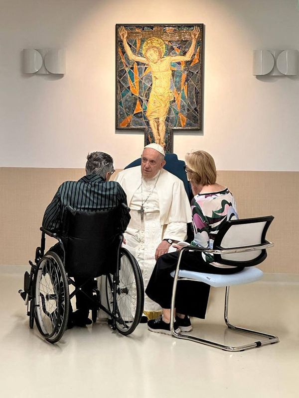 Les images montrent un pape François en fauteuil roulant dans le service de cancérologie pour enfants, qui se trouve à proximité de la chambre où il est en convalescence depuis plus d’une semaine.