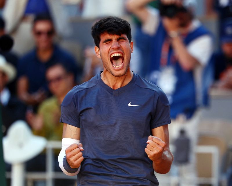 PARIS (Reuters) – Le numéro trois mondial Carlos Alcaraz s’est qualifié pour la première fois de sa carrière en finale de Roland-Garros grâce à sa victoire vendredi face au deuxième joueur mondial Jannik Sinner (2-6, 6-3, 3-6, 6-4, 6-3 en 4h09).