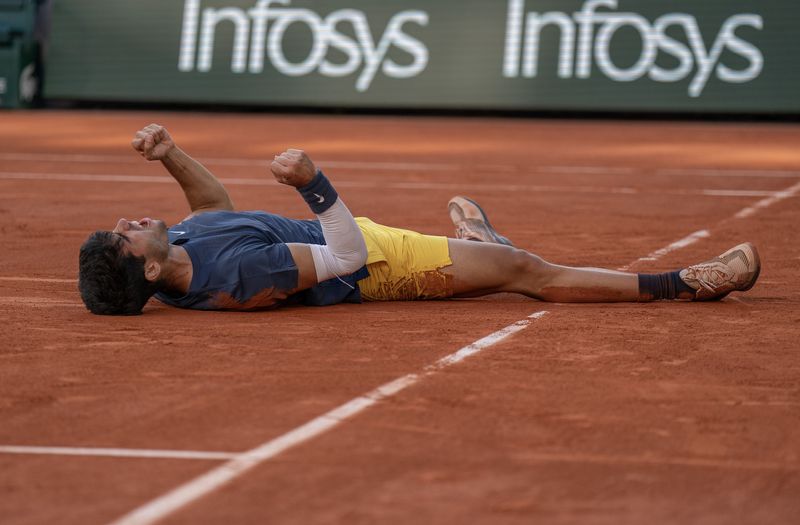 PARIS (Reuters) – Le troisième joueur mondial Carlos Alcaraz a remporté dimanche son premier Roland-Garros et son troisième titre du Grand Chelem en battant l’Allemand Alexander Zverev à l’issue d’une finale indécise (6-3, 2-6, 5-7, 6-1, 6-2 en 4h19).