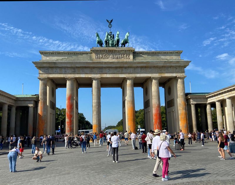 FRANCFORT (Reuters) – Des militants écologistes ont aspergé de peinture orange et jaune les colonnes de la célèbre porte de Brandebourg à Berlin dimanche pour demander la fin des énergies fossiles d’ici à 2030.
