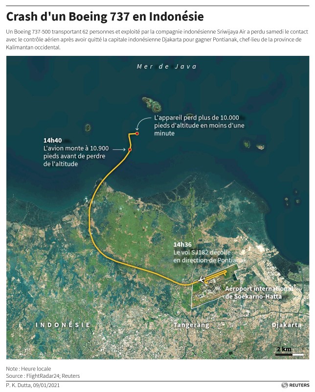 DJAKARTA (Reuters) – Un Boeing 737-500, transportant 62 personnes et exploité par la compagnie indonésienne Sriwijaya Air, s’est écrasé samedi en mer quelques minutes après avoir quitté Djakarta, ont annoncé les autorités.