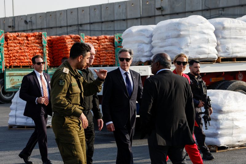 KEREM SHALOM, Israël (Reuters) -Le secrétaire d’Etat américain, Antony Blinken, a visité mercredi un point de contrôle israélien via lequel est acheminée de l’aide dans la bande de Gaza, d’où retentissaient des frappes, alors que des responsables israéliens ont mis en avant les efforts pour accroître l’aide humanitaire aux Palestiniens.