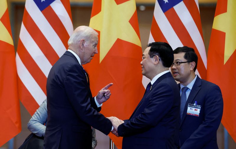 HANOÏ (Reuters) – Des dirigeants de grandes entreprises américaines et vietnamiennes des secteurs des semi-conducteurs, de la technologie et de l’aviation se sont rencontrés lundi, à l’occasion de la visite du président américain Joe Biden à Hanoï, au Vietnam, donnant lieu à l’annonce de nouveaux contrats portant sur l’achat d’avions et l’intelligence artificielle (IA).
