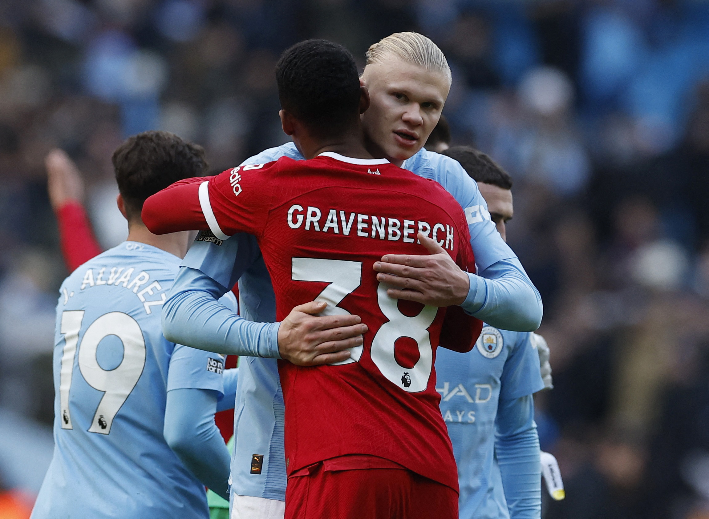 Pas de vainqueur dans ce choc au sommet de la 13e journée de Premier League. Manchester City a concédé le point du nul face à Liverpool samedi après-midi à l’Etihad Stadium (1-1). Dominateurs dans le jeu, les hommes de Pep Guardiola ont été récompensés par l’ouverture du score de l’inévitable Erling Haaland sur une offrande de Nathan Aké (27e). L’attaquant norvégien a atteint la barre symbolique de 50 buts inscrits depuis son arrivée dans le championnat anglais en… 48 matchs joués. En seconde période, les Reds se sont montrés plus efficaces et Trent Alexander-Arnold a égalisé à la suite d’un superbe enchaînement en fin de match (80e). Ce match nul n’arrange aucune des deux équipes et laisse l’opportunité à Arsenal de s’emparer de la place de leader à l’issue de cette 13e journée.