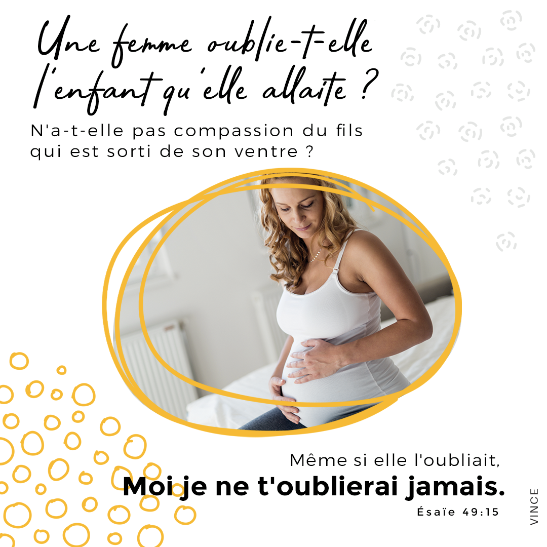 Une femme oublie-t-elle l’enfant qu’elle allaite ? N’a-t-elle pas pitié du fruit de ses entrailles ? Quand elle l’oublierait, Moi je ne t’oublierai point. Esaïe…